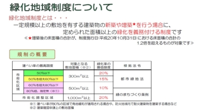 緑化地域とは、・・・一定規模以上の敷地を有する建築物の新築や増築を行う場合に、定められた面積以上の緑化を義務付ける制度です