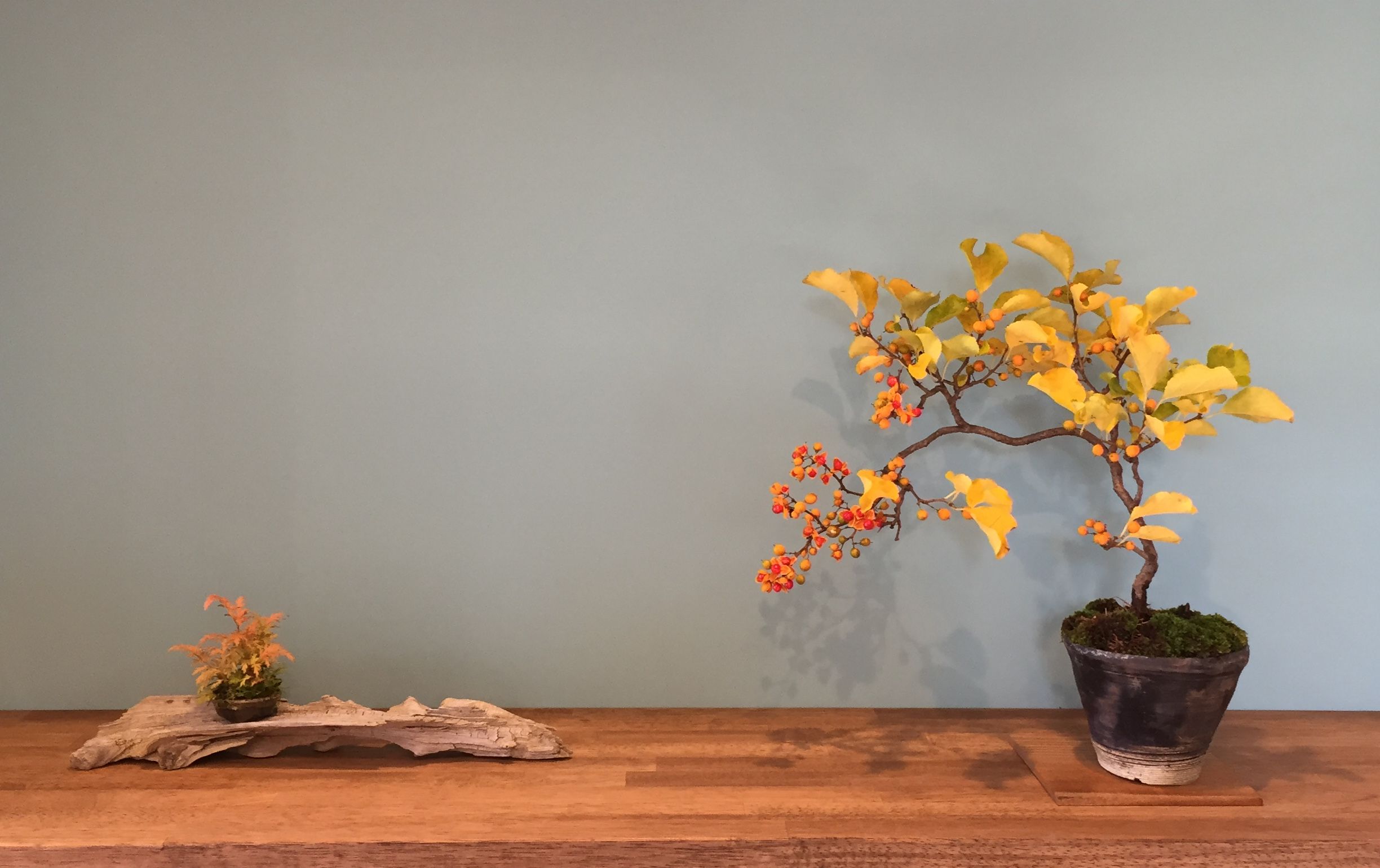 このツルウメモドキは実がついていないと何の変哲もない地味な樹ですが、実がなり割れだすと秋の棚でひときわ目立つようになります。