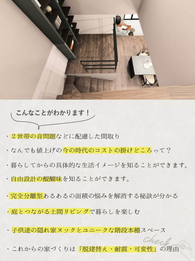 30代ご夫婦と小学生のお子様2人、ご親族、総勢5名が暮らす、完全分離型二世帯住宅の完成見学会のご案内です。