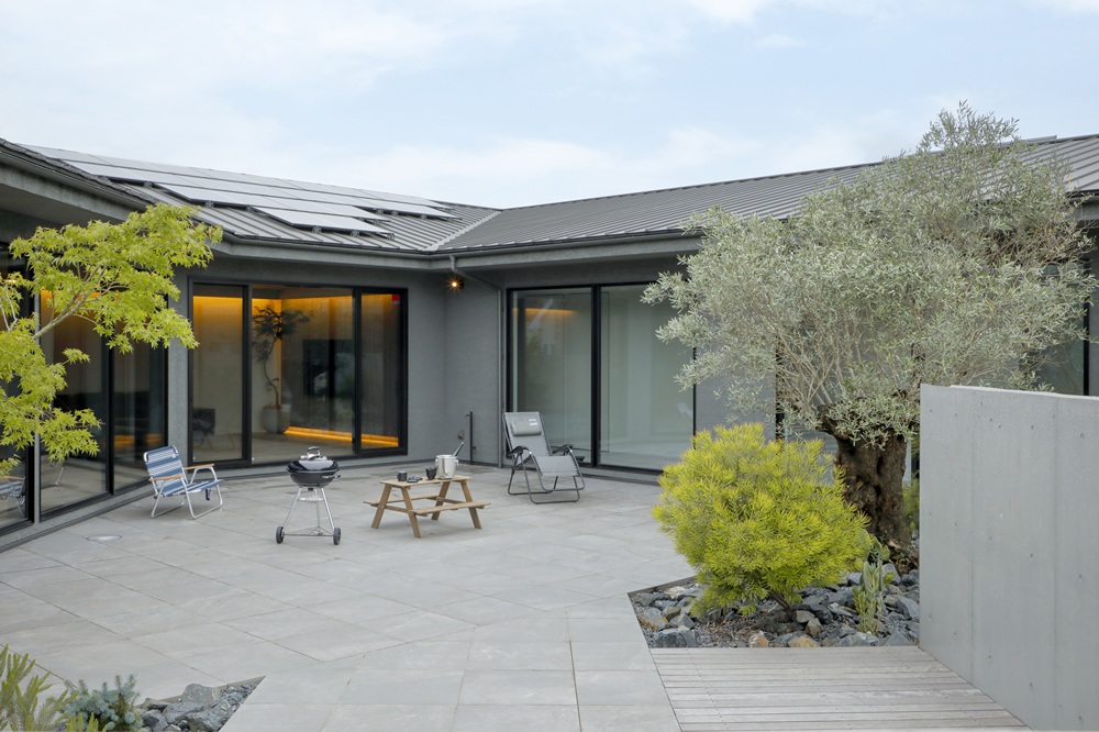 Ⅴ字形状でどこからも中庭を眺められるスタイリッシュな平屋ガレージハウス